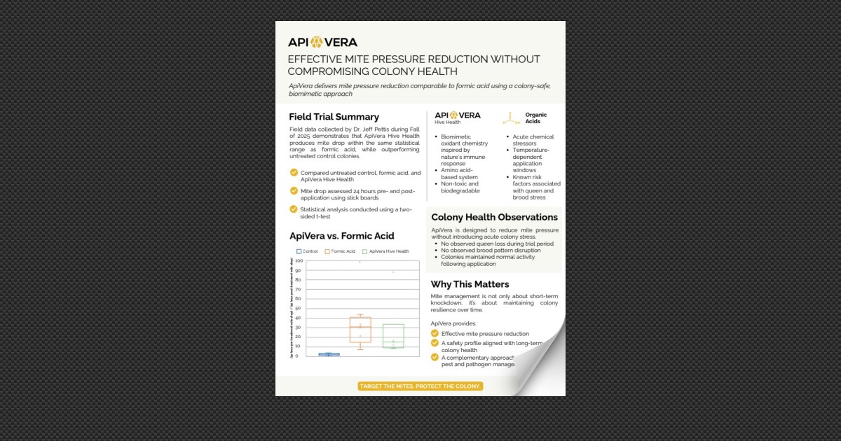 Field data collected by Dr. Jeff Pettis during Fall of 2025 demonstrates that ApiVera Hive Health produces mite drop within the same statistical range as formic acid, while outperforming untreated control colonies.