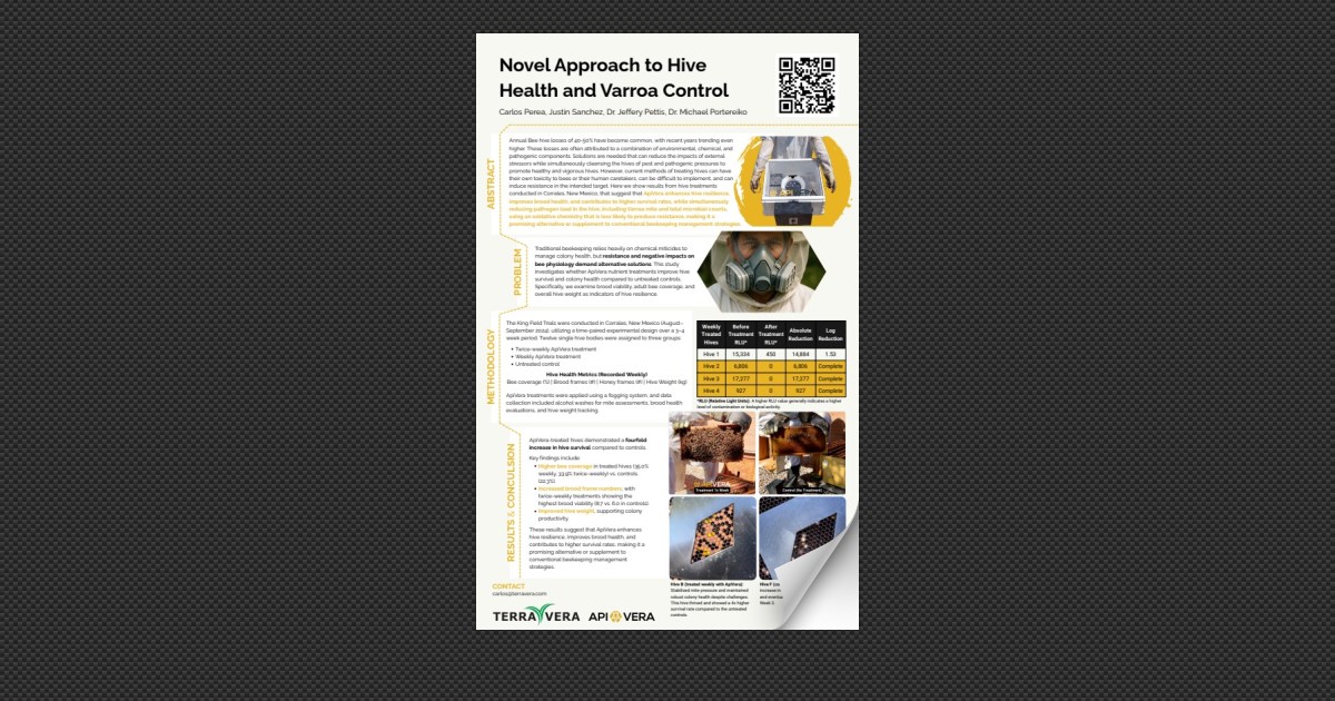 Varroa mites pose a significant threat to honey bee colonies, particularly during the fall when they become most problematic. Commonly used treatments to mitigate Varroa mites infestations and other stressors are either ineffective or harmful to the bees. Our study revealed that Terra Vera solution provided 2-4x the normalized mite drop in comparison to the standard industry mite treatment, Apiguard.