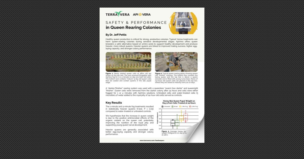 Healthy queen production is critical for strong, productive colonies. Typical Varroa treatments can harm queen-rearing colonies during sensitive developmental stages. ApiVera offers queen breeders a safer alternative based on amino acids to support healthy development and produce heavier, more robust queens. Heavier queens are linked to improved mating success, higher egg laying capacity, and stronger colony performance.